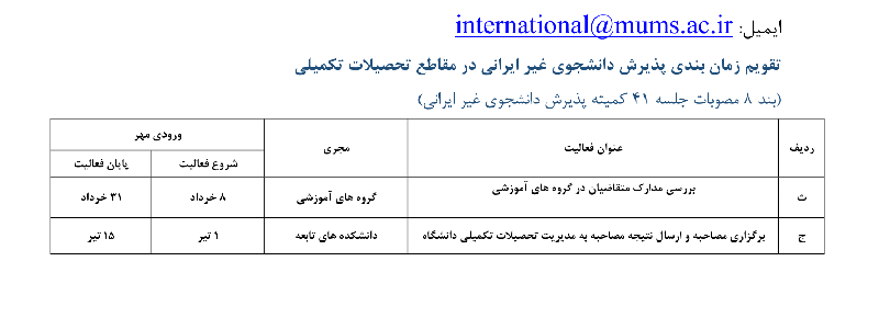 31 خرداد 1401 تقویم زمان بندی پذیرش دانشجوی غیر ایرانی در مقاطع تحصیلات تکمیلی متقاضیان غیر ایرانی می توانند برای ارسال درخواست تحصیل با ایمیل زیر مکاتبه نمایند. قبلی بعدی
