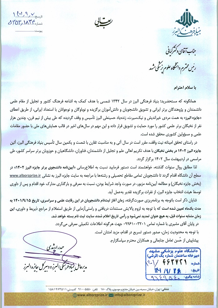 ارسال پوستر آئین نامه دانشجوی برتر جایزه البرز 1402 از بنیاد فرهنگی البرز