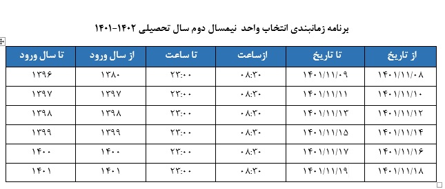 برنامه زمانبندی انتخاب واحد در نیمسال دوم 1401