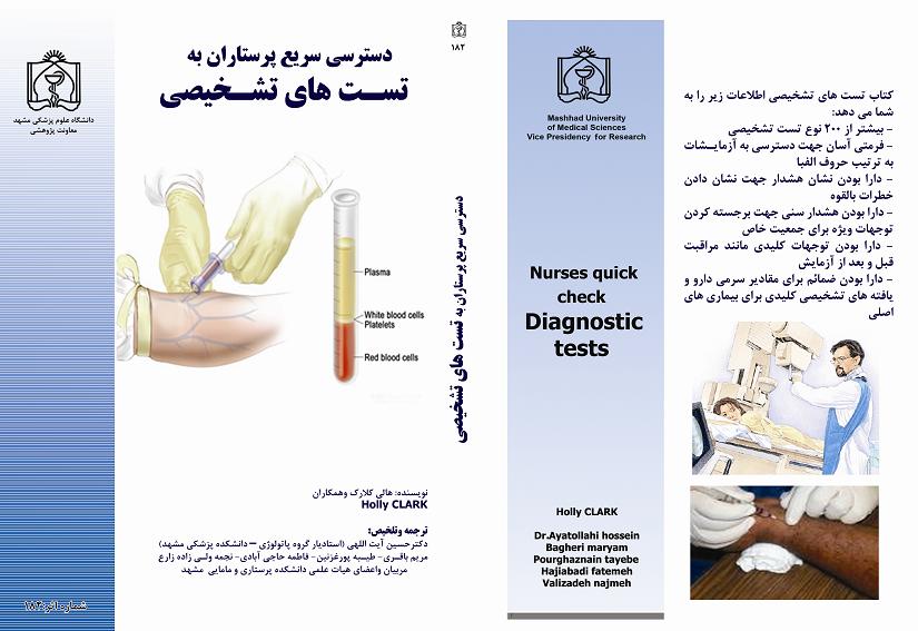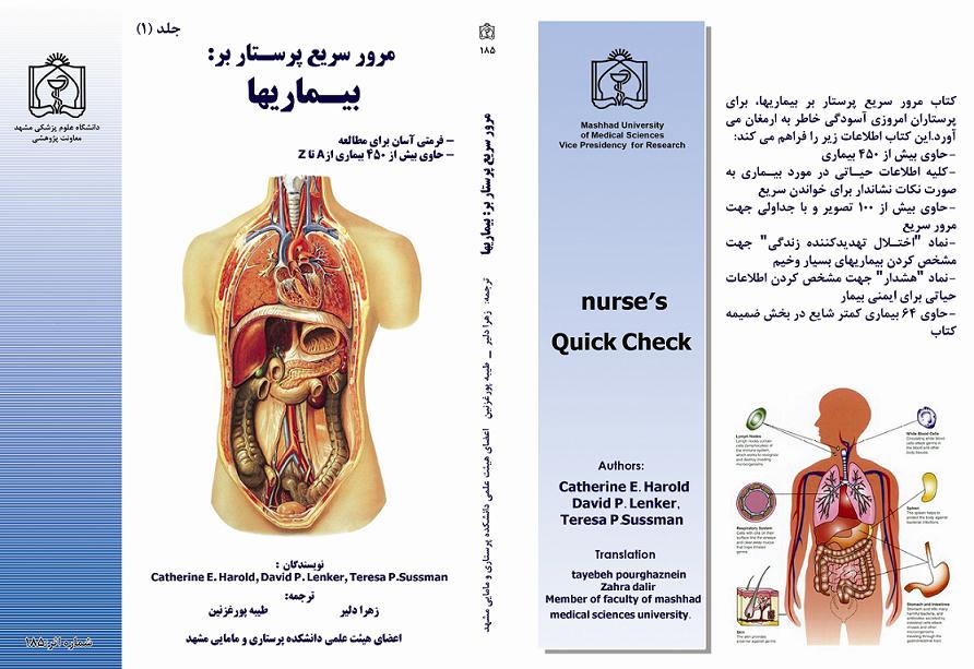 هالي کلارک و همکاران،دسترسي سريع پرستاران به تست هاي تشخيصي،ترجمه و تلخيص آيت اللهي ح،باقري م،پورغزنين ط،حاجي آبادي ف،ولي زاده ن،انتشارات دانشگاه علوم پزشکي مشهد ، معاونت پژوهشي،1390. طيبه پورغزنين ، محمد رجب پور ،اختلالات آب و الکتروليت ، مايع درماني داخل وريدي،مشهد،انتشارات يار آشنا ،1390. کاترين اي هارولد،ديويد پي لنگر، ترزا پي ساسمن.مرور سريع پرستار بر بيماريها،ترجمه زهرا دلير،طيبه پورغزنين ،جلد1 و2،انتشارات دانشگاه علوم پزشکي مشهد ، معاونت پژوهشي،1389 سعيد فقيه بمرود،طيبه پورغزنين ، تشخيص افتراقي آريتمي ها ،چاپ اول ، مشهد ، انتشارات بانگ الست 1383. |