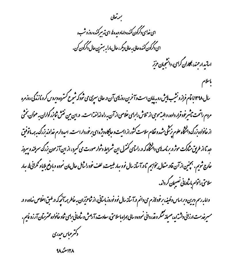 پیام رییس محترم دانشکده به مناسبت فرارسیدن نوروز 1399
