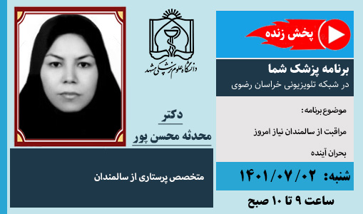 02 مهر 1401 بازدید: 112 برنامه پخش زنده دکتر محدثه محسن پور با موضوع "مراقبت از سالمندان نیاز امروز" قبلی بعدی