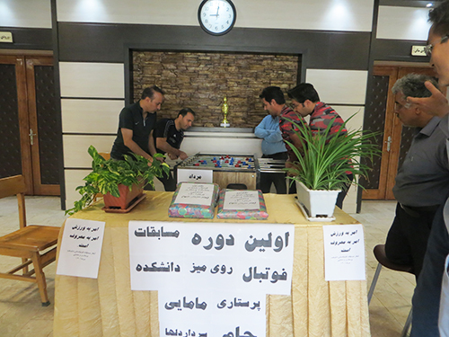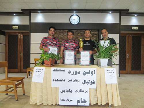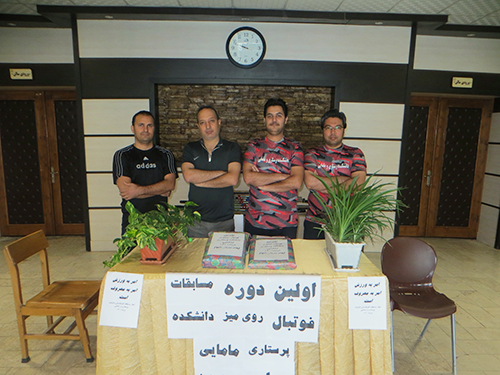 همزمان با هفته دولت، مسابقات فوتبال روی میز پرسنل دانشکده پرستاری و مامایی با حضور 8 تیم در غالب 16 نفر از پرسنل دانشکده شروع و در هفته وحدت، همزمان با میلاد حضرت رسول (ص) بازی فینال با حضور معاون اداری مالی، مسئول حراست و رئیس اموراداری دانشکده در سالن تالار ابن سینا برگزار گردید. این بازی بین تیم سردار (وحید مومن – محسن غلامی) و تیم اداری (حمید کریمی – مسعود امیری) انجام شد. و در پایان، تیم سردار با نتیجه 4 بر 1 به برتری رسید و کاپ قهرمانی را بالای سر برد. برگزاری مدون و منظم برنامه های فرهنگی و ورزشی برای پرسنل باعث ایجاد شور و شعف، نشاط و شادی، همدلی و همبستگی و سلامتی می گردد. |