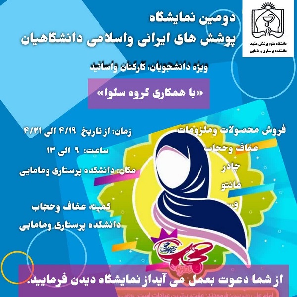 به مناسبت هفته عفاف و حجاب، دومین نمایشگاه پوشش های ایرانی و اسلامی دانشگاهیان در دانشکده پرستاری و مامایی از تاریخ ۱۹ لغایت ۲۱ تیرماه از ساعت ۹ تا ۱۳ در دانشکده پرستاری و مامایی برگزار می گردد. از کلیه همکاران محترم دعوت به عمل می آید از این نمایشگاه دیدن فرمایند. روابط عمومی دانشکده پرستاری و مامایی