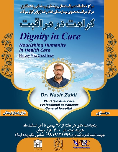دوره ی کشوری کرامت در مراقبت توسط مرکز تحقیقات مراقبت های پرستاری و مامایی با همکاری مرکز مراقبت معنوی بیمارستان امام رضا(ع) به صورت هفتگی از 26 بهمن ماه لغایت 24 اسفند ماه به صورت مجازی به مدت 5 هفته ( 8 الی 10 صبح) و هفته ی آخر این دوره 24 اسفند ماه ( 8 الی 12 ظهر) برگزار خواهد شد. مدرس این دوره جناب آقای دکتر سید ناصر زیدی متخصص مراقبت معنوی از ونکوور کانادا میباشند، این دوره دارای امتیاز فرهنگی بوده و فراخوان شرکت در این دوره برای تمامی اعضای هیئت علمی کشور ارسال شده است.